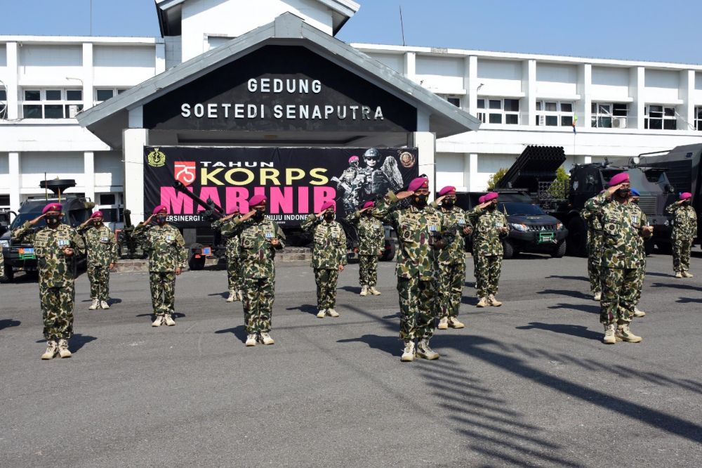SURABAYA, HNN - Dalam rangka memperingati HUT ke 75 korps Marinir Prajurit petarung Marinir ikuti upacara HUT Ke 75 Korps Marinir di depan Mako Ksatrian Soetedi Senaputra , Karang Pilang, Surabaya, Jawa Timur, Senin (16/11/2020).