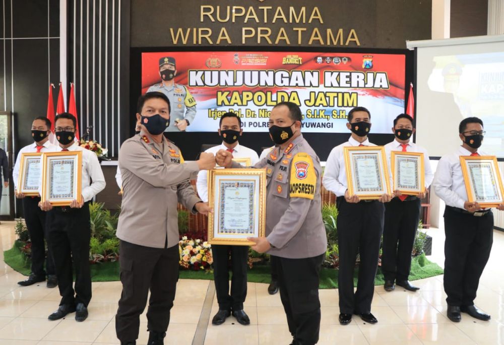 "Terimakasih atas penghargaan yang diberikan oleh Bapak Kapolda Jatim dan ini akan menjadi semangat dan motivasi bagi kami yang ada di Polresta Banyuwangi," pungkasnya.