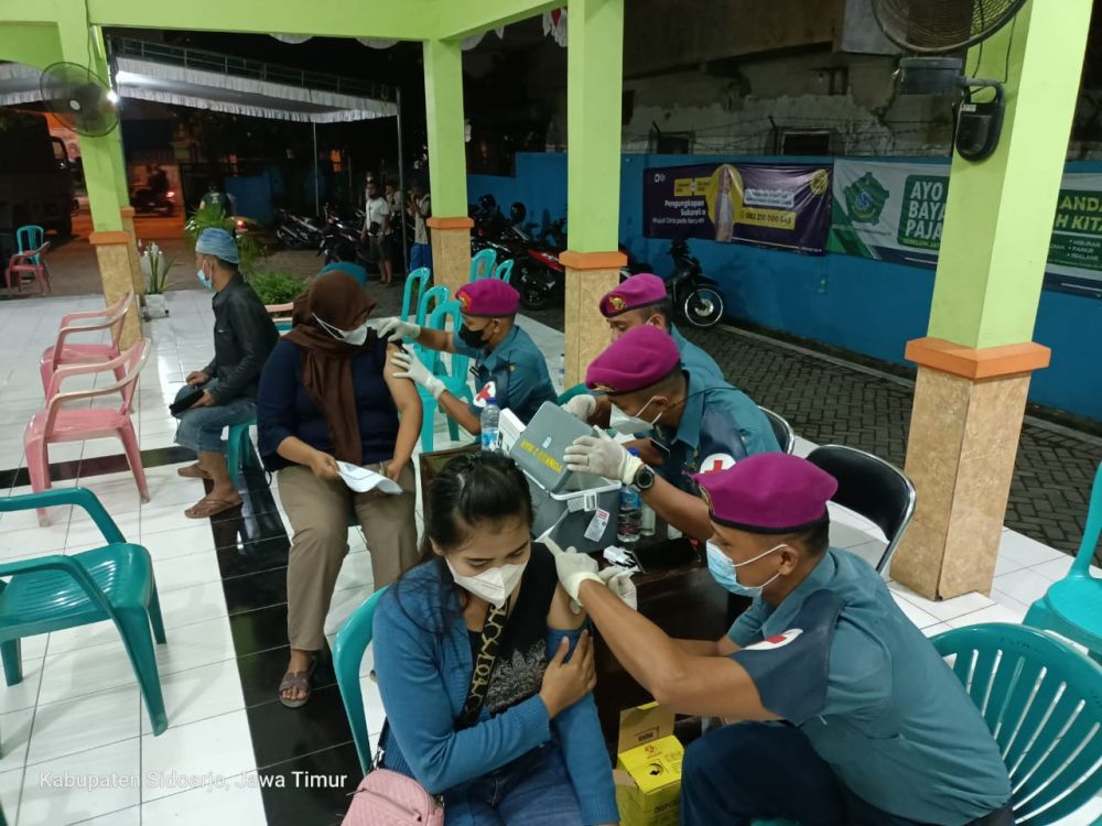 Sidoarjo, HNN - Dalam menindaklanjuti perintah harian Kepala Staf Angkatan Laut (Kasal) Laksamana TNI Yudo Margono agar seluruh jajaran TNI AL tetap intens mendukung program pemerintah untuk melakukan serbuan vaksinasi nasional guna terbentuknya Herd Immunity bagi masyarakat Indonesia, untuk itu Prajurit Kima Menart 2 Marinir laksanakan serbuan vaksin pada moument jelang libur nasional di selenggarakan di Pendopo Kantor Desa Waru Kabupaten Sidoarjo Jawa Timur, Kamis (28/04/2022). Malam.