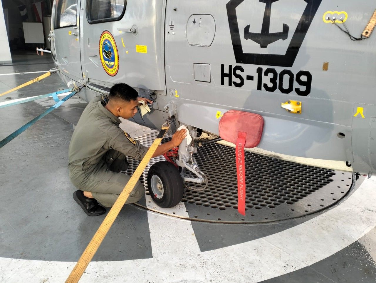 Hekikopter dengan nomor HS-1309 ini dipiloti oleh Lettu Laut (P) Andromeda dan Letda Laut (P) Andino tengah bertugas dalam mengamankan wilayah perairan Indonesia sejak awal Juli ini.