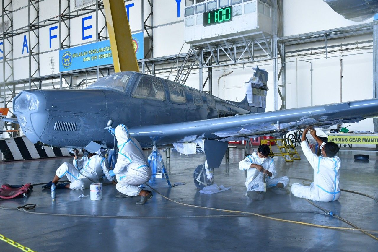 Puspenerbal, HNN - Agar tampil baru dan fresh, prajurit Depram (Departemen Rangka Akp Mesin) Fasilitas Pemeliharaan dan Perbaikan Pesawat Udara (Fasharkan Pesud) Puspenerbal, melaksanakan painting pesawat Bonanza G-36 nomor Lambung T-2504 bertempat di Hanggar 1 Fasharkan Pesud, Hari Selasa (23/7/2024).