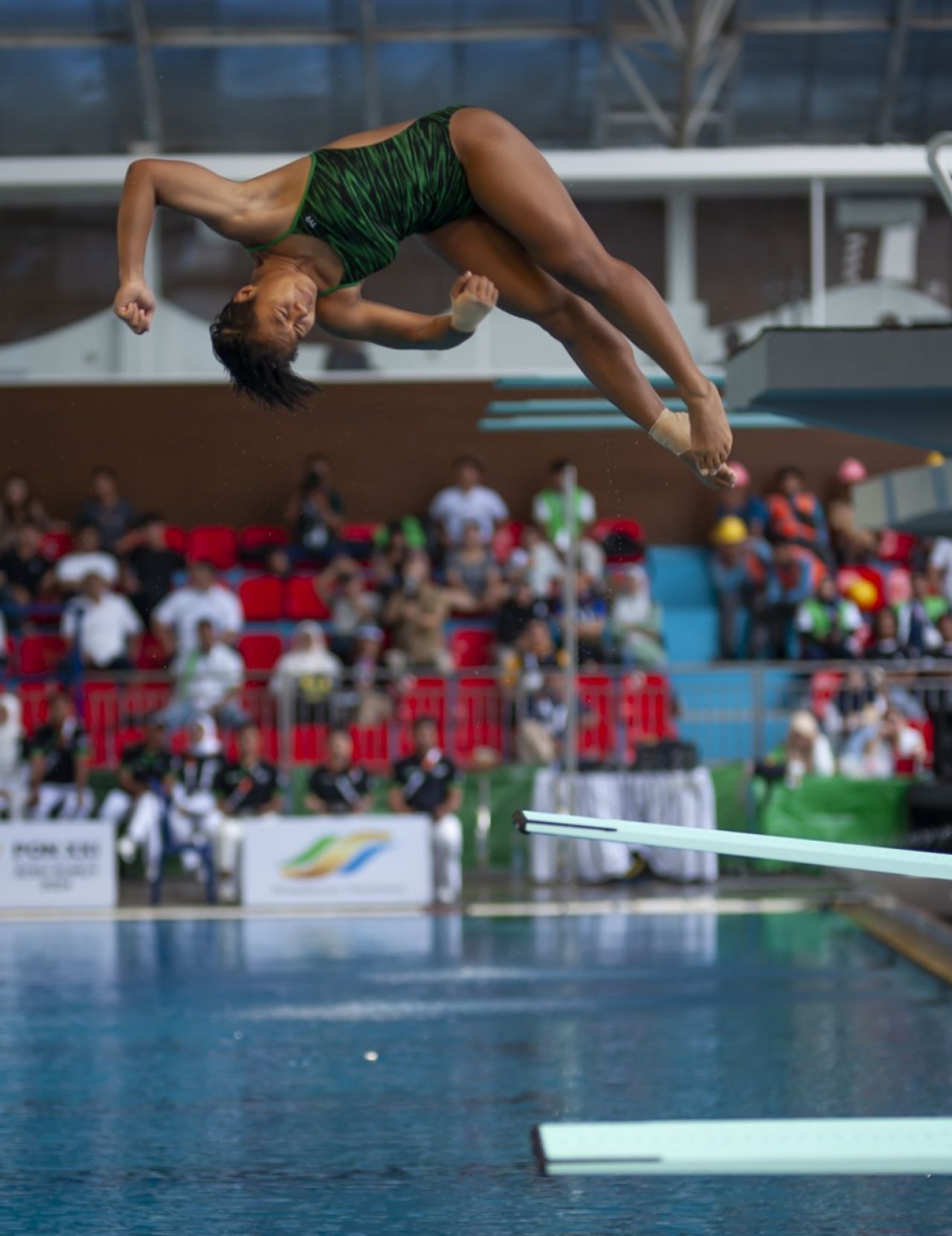 Pada pertandingan di ketinggian terendah dalam loncat indah ini, para atlet tampak pamer aksi semaksimal mungkin untuk meraih poin tinggi dari para juri.