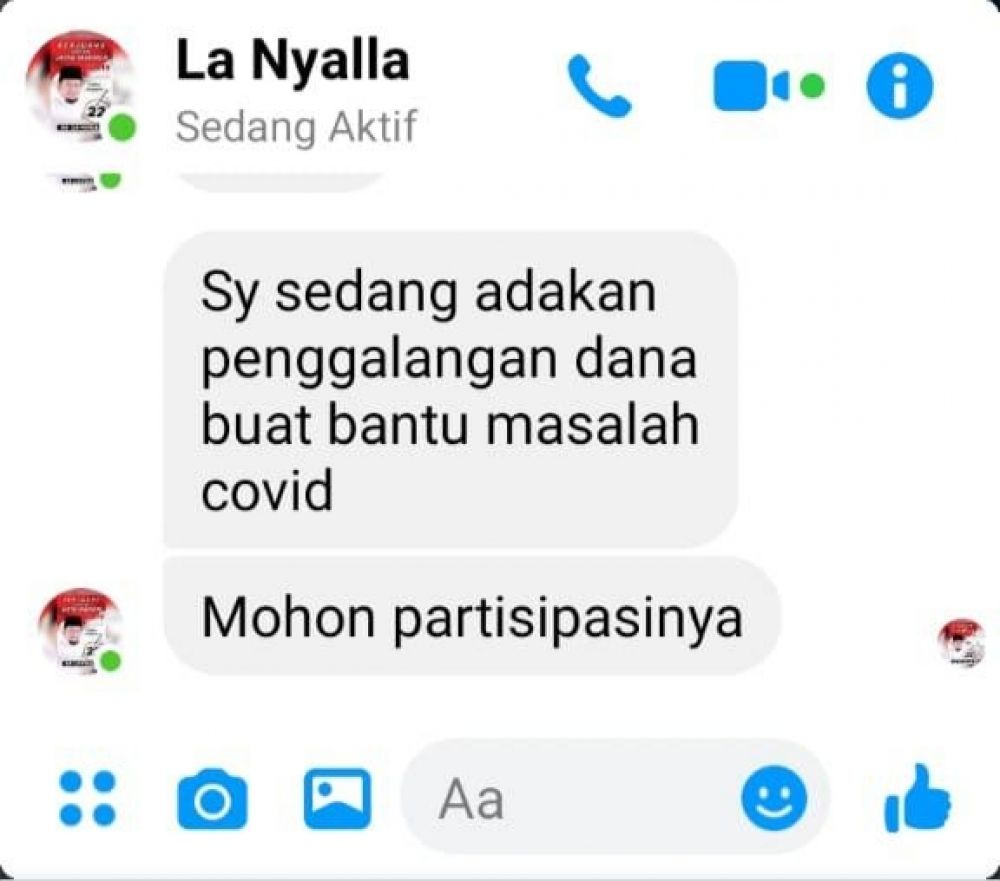 "Saya sedang adakan penggalangan dana buat bantu masalah covid. Mohon Partisipasinya," bunyi pesan pelaku, yang di screenshot dan dikirim Ketua DPD RI LaNyalla, Jumat (02/10/2020).