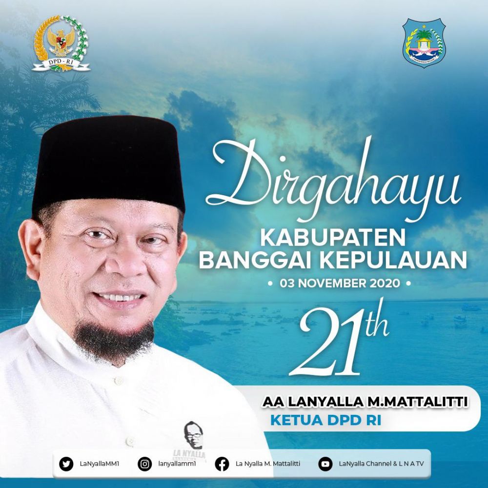 JAKARTA, HNN - Dalam Usia ke 21 Tahun Kabupaten Banggai Kepulauan. Ketua DPD RI AA LaNyalla Mahmud Mattalitti mengucapkan selamat hari lahir Kabupaten Banggai Kepulauan. Selasa, 3 November 2020.