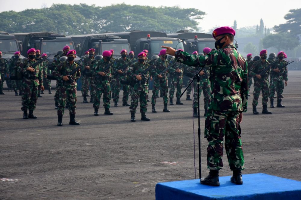 Surabaya, HNN - Komandan Resimen Artileri 2 Marinir Kolonel Marinir Aris Budiadi, S.Pi., M.M., yang diwakili Perwira Staf Operasi (Pasops) Menart 2 Marinir Letkol Mar Rana Karyana, S.E., M.Tr.Hanla., M.M., memimpin apel gelar kesiapan personel dan material Menart 2 Marinir di Lapangan Apel Ksatrian Marinir Soetedi Senaputra Karangpilang , Surabaya, Jawa Timur. Selasa (01/12/2020).