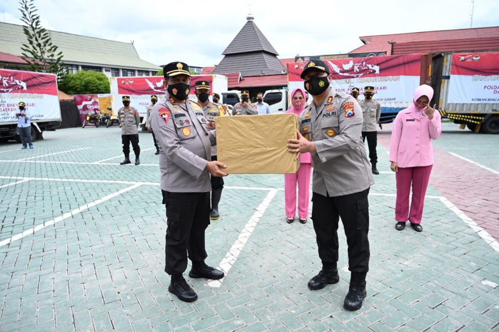 Adapun bantuan yang diterima dari Polda Jatim berisi antara lain paket sembako serta barang kebutuhan lainnya seperti perlengkapan bayi, masker, hand sanitizer, obat-obatan, pakaian, sabun, dan handuk.