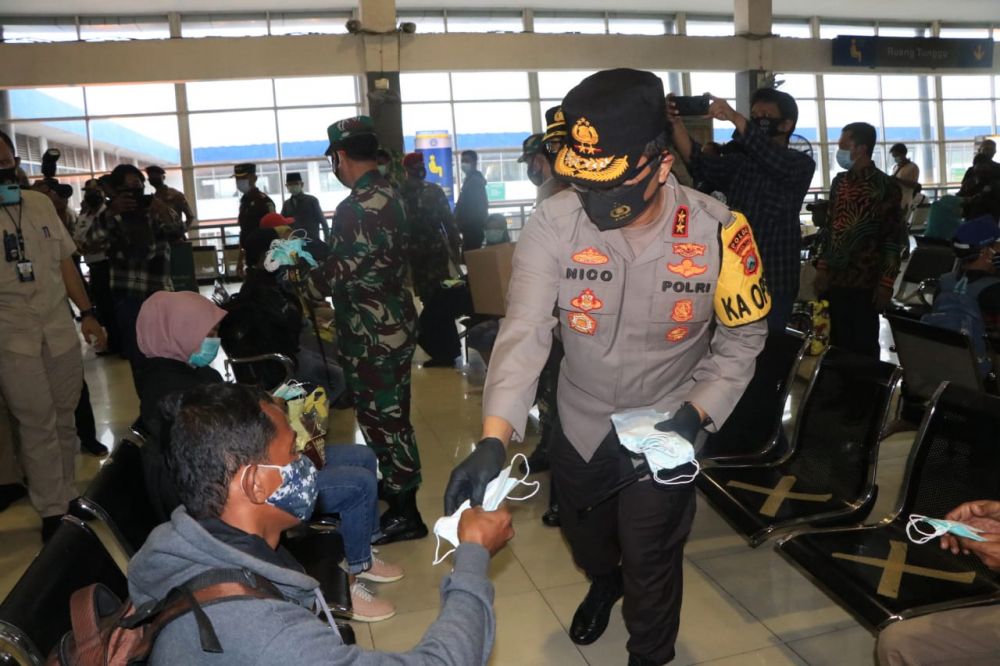 Selain meninjau dan memantau kegiatan masyarakat di terminal purabaya, Kapolda Jatim, Pangdam V Brawijaya dan Pangkoarmada II, juga membagikan 10.000 masker kepada penumpang baik yang akan berangkat maupun yang baru tiba, para awak bus, serta membagikan 300 paket sembako bagi masyarakat kurang mampu yang beraktifitas di Terminal purabaya seperti porter kuli angkut barang.