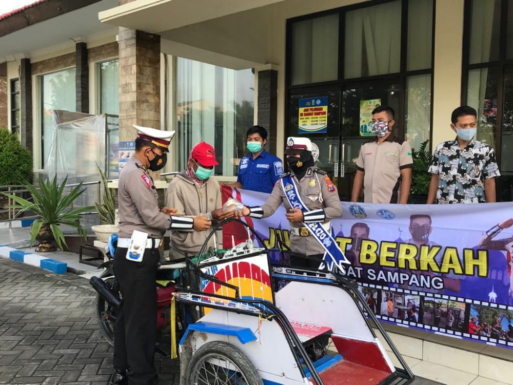 Untuk diketahui, di lokasi Kanit Regident Polres Sampang IPDA Iwan Suhadi SH, bersama anggotanya membagikan bantuan langsung berupa, Masker dan Nasi bungkus kepada abang-abang becak yang terlihat mangkal di Jalan Raya Kota Sampang.