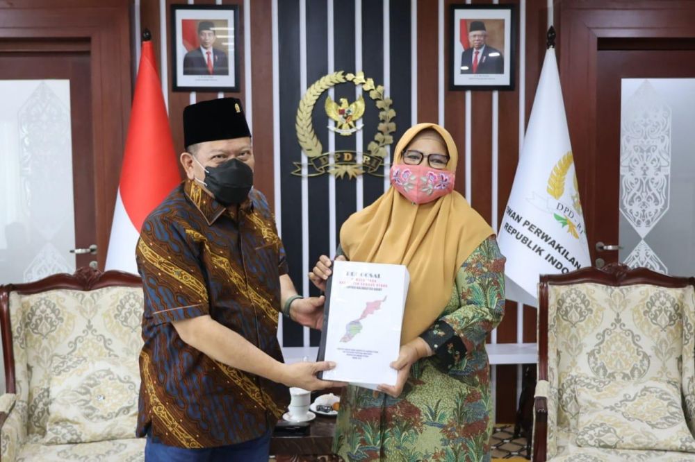 Dukungan disampaikan LaNyalla saat menerima audiensi Wakil Bupati Sambas, Hairiah, di kantor DPD RI, Jakarta, Rabu (2/6/2021). Ia didampingi Sekjen DPD RI Rahman Hadi.