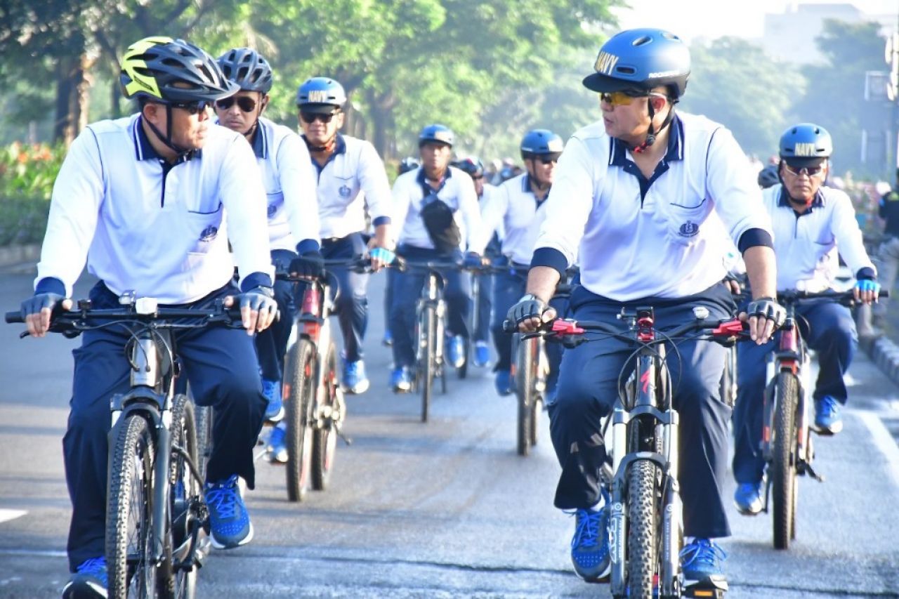 Surabaya, HNN - Dalam rangka pembinaan fisik, sinergitas dan silaturahmi jelang peringatan HUT ke-78 Penerbangan TNl AL 2024, Komandan Pusat Penerbangan TNl Angkatan Laut (Danpuspenerbal) Laksda TNl Sisyani Jaffar mengikuti Fun Bike sekaligus bakti sosial bersama para Pangkotama TNl AL wilayah Surabaya beserta jajarannya pada Selasa pagi (23/4/2024).