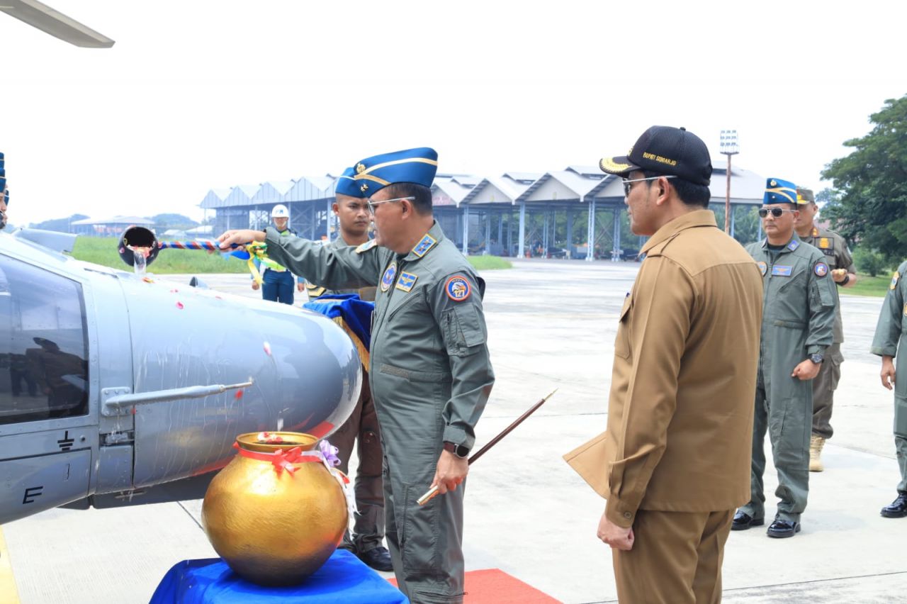 Komandan Puspenerbal menyiramkan air bunga ke bagian nose Helikopter AS565 MBe Panther baru dan pemecahan kendi usai tradisi Water Salute dilakukan, didampingi Bupati Sidoarjo, H. Subandi dan Wadan Puspenerbal, Laksma TNl Bayu Alisyahbana.