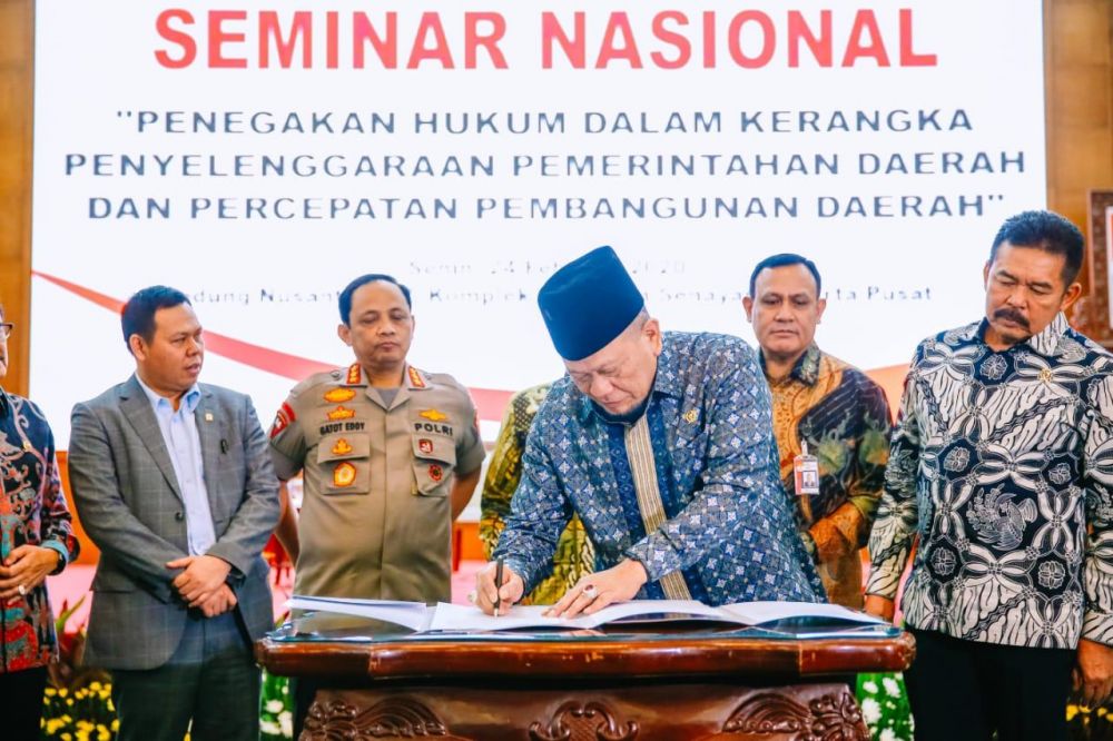 JAKARTA, HNN - Lima kesimpulan yang ditandatangani Ketua DPD RI dan para narasumber menandai berakhirnya Seminar Nasional dengan tema Penegakan Hukum dalam Kerangka Penyelenggaraan Pemerintah Daerah dan Percepatan Pembangunan Daerah, yang digelar DPD RI di Gedung Nusantara IV, Senin (24/2/2020).