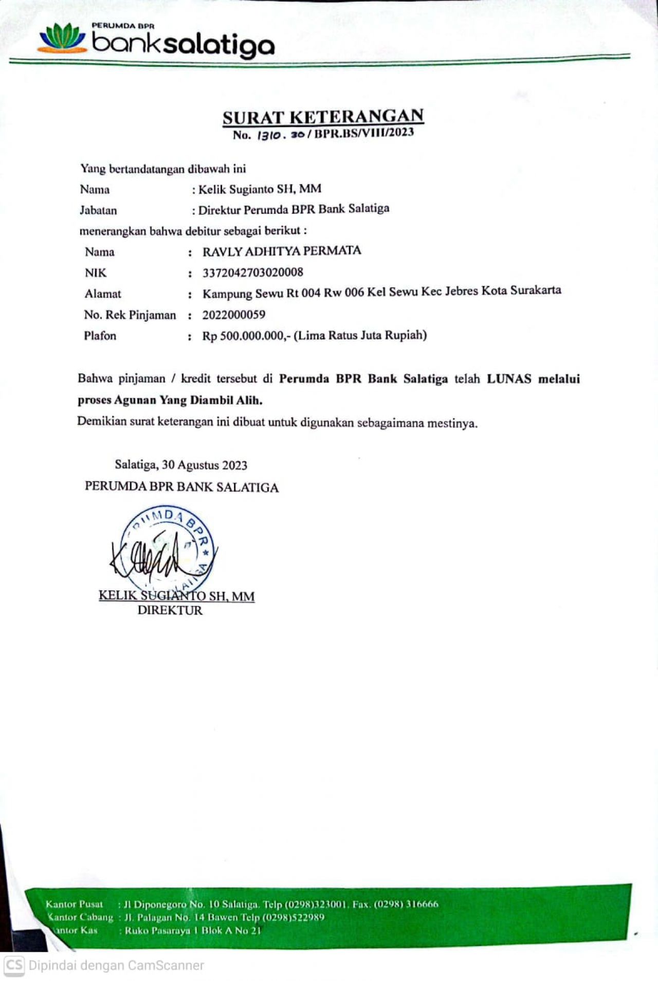 Melalui mekanisme tersebut, aset jaminan berupa tanah dan bangunan diserahkan kepada bank dan selanjutnya dituangkan dalam akta jual beli. Pada 30 Agustus 2023, bank menerbitkan surat keterangan yang menyatakan fasilitas kredit Ravly telah lunas melalui proses AYDA.