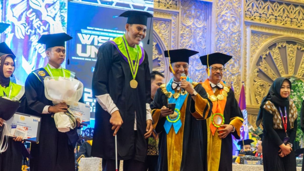 SURABAYA-HNN: Di tengah keriuhan 1.437 wisudawan Universitas Negeri Surabaya (Unesa) edisi ke-119, Rabu (29/4/2026), sepasang langkah tegap menarik perhatian seluruh pasang mata di Graha Unesa. Ia adalah Elpanta Tarigan. Dengan postur menjulang setinggi 215 sentimeter—salah satu yang tertinggi di Indonesia—sosoknya tampak seperti raksasa. Namun, bukan tinggi badannya yang membuat Rektor Unesa, Prof. Dr. Nurhasan, M.Kes (Cak Hasan), memberikan penghormatan "Karpet Merah", melainkan kegigihan mentalnya yang tak tertembus kegelapan.