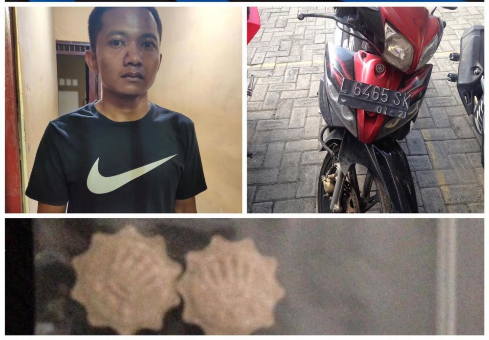 "Selanjutnya tersangka berikut barang bukti 2 butir pil ekstasi warna coklat berlogo mahkota beserta Sepeda motor Jupiter dengan nopol polisi, L 6465 SK yang digunakan sebagai sarana juga diamkan dan dibawa ke Mako Polsek guna proses penyidikan lebih lanjut." tambahnya.