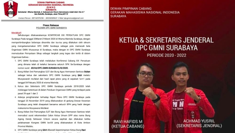 6. DPC GMNI Surabaya yang SAH dibawah kepemimpinan Ketua Bung Ravi Hafids Maheswara, dan Sekretaris Bung Achmad Yusril Yusyar Yahya berdasarkan Surat Keputusan bernomor: 027/ SK/ DPP. GMNI/ VII/ 2020 tertanggal semenjak dikeluarkan press realese hari ini.