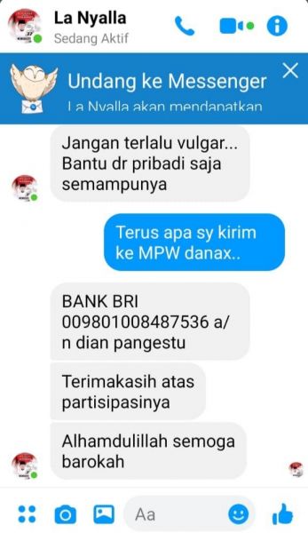"Jangan telalu vulgar bantuan dari pribadi saya semampunya. Kirim saja ke rek BRI 009801008487536 atasnama Dian Pangestu," tulisnya lagi.